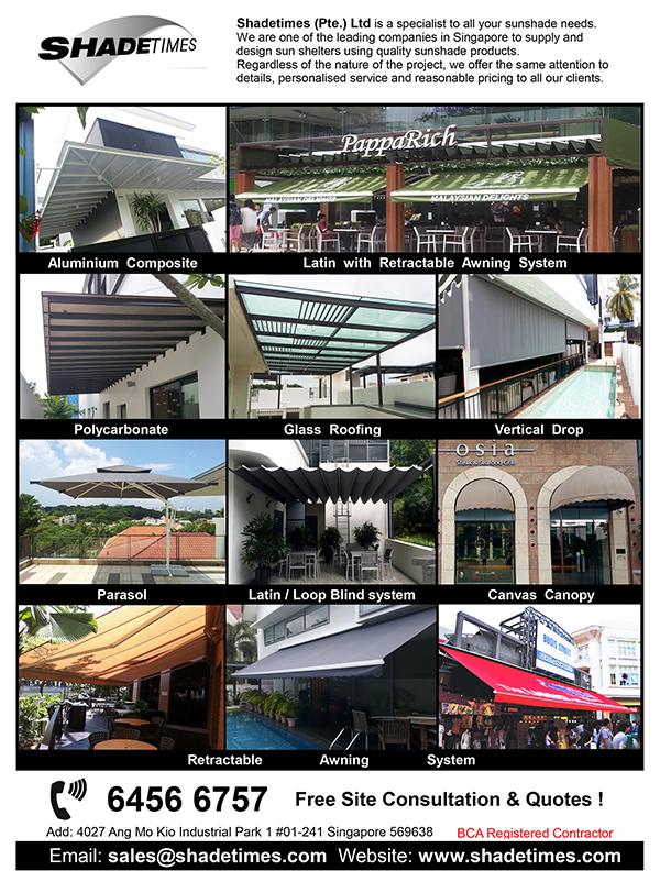 Shadetimes (Pte.) Ltd is a specialist for all your sunshade needs. Being one of the leading companies in Singapore in design and manufacturing of sunshades, we offer a wide range of products including Retractable Awning Systems, ZEN Latin Systems, Outdoor Vertical Drop Systems, Fixed Roofings, Outdoor Parasols and other related products.
